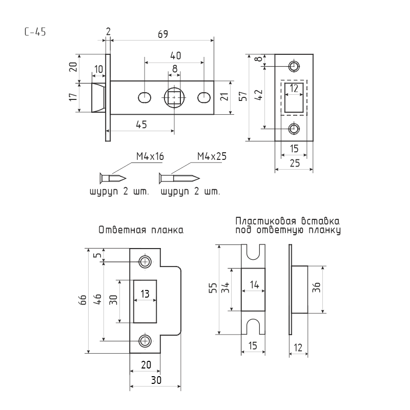 Модель С-45 – это защелка дверная врезная, предназначенная для закрывания и фиксации в закрытом положении межкомнатных деревянных дверей. Стандартное отверстие под квадрат 8х8 мм позволяет комплектовать данную защелку с любой ручкой раздельной на розетке, вне зависимости от производителя. Механизм оснащен прочным и надежным стальным ригелем, есть отверстия под стяжные винты. Тип конструкции – универсальный. Это позволяет устанавливать механизм на двери левого и правого открывания.
