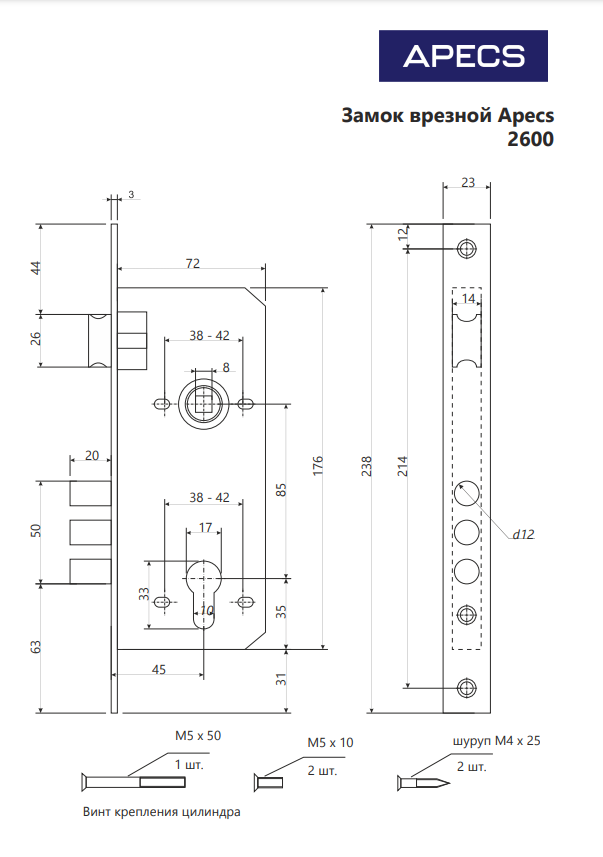 Замок врезной Apecs2600-CR с ответной планкой и накладкой — элемент дверной фурнитуры. Предназначен для входной двери, ворот или решетки. Замок такого типа подходит для городских квартир, частных домов и служебных помещений, может устанавливаться на правые и левые двери. Врезной механизм надежен в эксплуатации, не портит внешний вид дверного полотна. Замок изготовлен из прочной оцинкованной стали, стойкой к коррозии. Хромированная лицевая планка высотой 238 мм и шириной 23 мм имеет квадратные концы. Ширина запорной планки — 23 мм.
