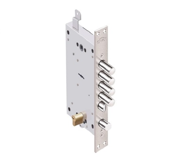 Замок врезной двухсистемный Рубин 1.08.46 шести сувальдный, для бронированных и металлических дверей усиленной конструкции. Соответствует 4 классу безопасности. Наличие распорных втулок в корпусе замка увеличивает его жесткость и исключает зажатие сувальдного механизма при установке замка в дверь.