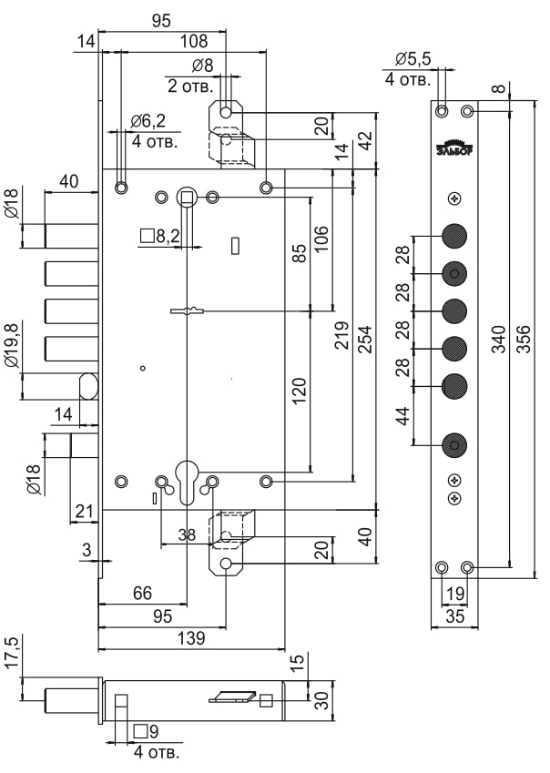 Замок (Эльбор) врезной двухсистемный Рубин 1.08.46 с тягами, 5 кл.